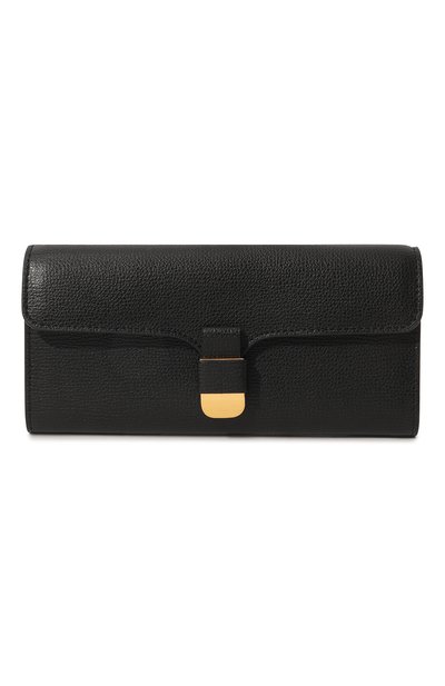 Для пошива черного кошелька мастера марки использовали прочную фактурную кожу, устойчивую к появлению заломов и царапин. Модель застегивается на кнопку широким клапаном с золотистой полированной пряжкой. В основном отделении есть разделительный карман для монет, слоты для банковских карт и отсеки для купюр.