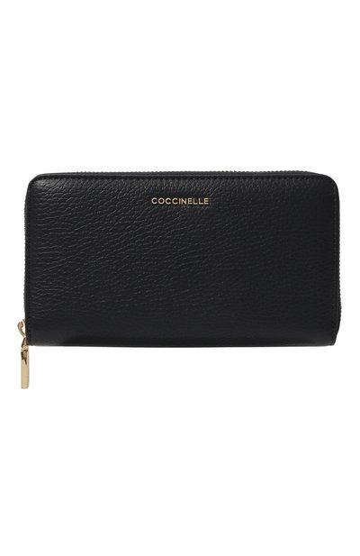 Лаконичный черный кошелек с небольшим металлическим логотипом на передней панели долго будет сохранять первоначальный вид: аксессуар сшили из мягкой зернистой кожи, которая не боится потертостей и царапин. Внутри предусмотрели отделения для купюр и чеков, слоты для кредитных карт и карман, застегивающийся молнией.