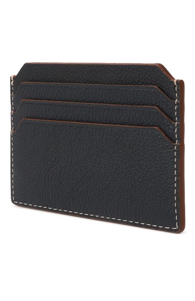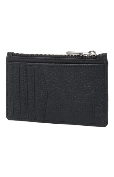 В темно-синий картхолдер поместятся шесть кредитных карт, чеки и монеты. Для этого предусмотрели плоские слоты, два отделения и карман, застегивающийся на молнию. Аксессуар, украшенный серебристым тисненым логотипом бренда на передней панели, выполнили из прочной эластичной кожи с крупным зернением и легким блеском.