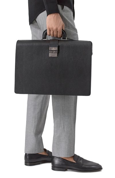 Для изготовления черного портфеля мастера марки использовали прочную фактурную кожу, на которой долго не появятся заломы и царапины. Модель закрывается широким клапаном на прямоугольный замок-защелку с палладиевым покрытием, не тускнеющим со временем. В основное отделение с разделительным карманом на молнии поместятся документы формата А4, планшет и бумажник.