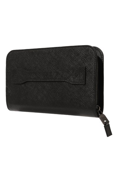 Темно-синее портмоне с отделениями для купюр и чеков и карманом для монет сшито из зернистой матовой кожи с деликатным блеском. Внешний слот для пластиковых карт украшен тисненым логотипом марки. Однотонный аксессуар, застегивающийся молнией, дополнен плоской горизонтальной ручкой.