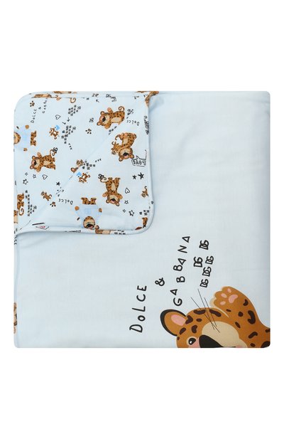 Две стороны пастельно-голубого од еяла перекликаются не только фирменной символикой и изображениями леопардов, но и нежным джерси. Трикотаж выполнили из хлопка с очень длинными волокнами, поэтому аксессуар получился особенно мягким. Между двумя слоями материала заключен пушистый полиэстер, который делает модель более теплой, не утяжеляя ее.