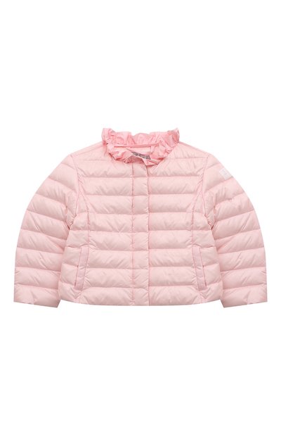 Для пошива пуховика оттенка клубничного десерта мастера марки использовали легкий прочный нейлон. Чтобы в куртке было комфортно во время прогулки в прохладную погоду, узкие стеганые камеры наполнили отборным утиным пухом, отлично удерживающим тепло. Модель со скрытой под планкой молнией декорировали широкой оборкой вдоль круглого выреза.