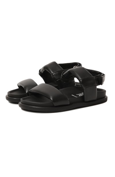 Черные сандалии с объемными ремешками из мягкой веганской кожи дополнены анатомической стелькой. Она правильно распределяет нагрузку на стопу во время ходьбы, а застежка велькро позволяет отрегулировать посадку модели по ноге. Обувь с гибкой подошвой украшена логотипом марки.