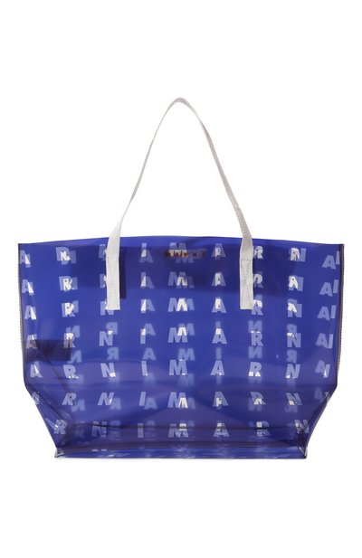 Синяя сумка сшита из полупрозрачного полимера с мотивом из повторяющегося логотипа бренда. Принт нанесен на внутреннюю сторону материала, поэтому белый оттенок букв кажется голубым. С рисунком перекликаются длинные глянцевые ручки, которые позволяют носить модель как в руке, так и на плече. Внутрь поместятся планшет, складной зонт и телефон.