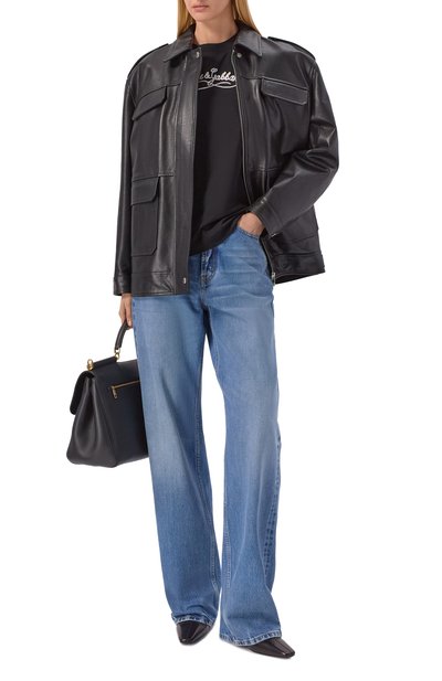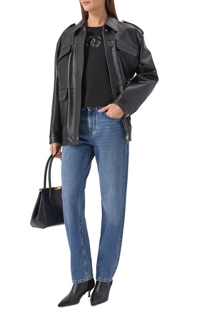 Черная облегающая футболка с короткими рукавами может заменить декорированный топ в образе с брюками, сапогами на шпильке и косухой. Доменико Дольче и Стефано Габбана дополнили модель вставками из ажурного кружева и серебристой металлической DG-монограммой. Изделие сшили из гладкого хлопкового трикотажа с добавлением стрейче вых волокон, поэтому оно садится точно по фигуре и не ограничивает движения.