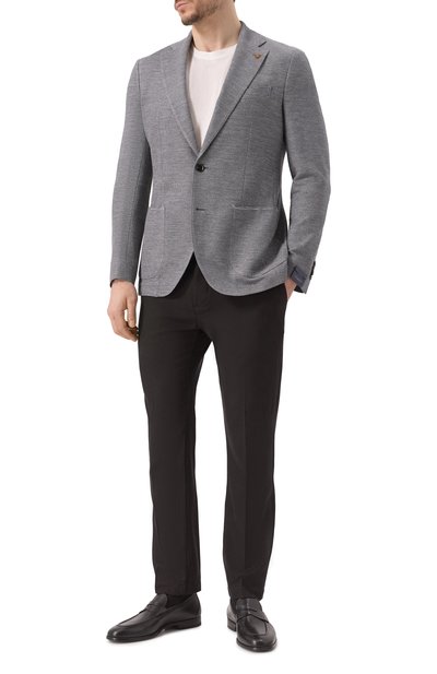 Укороченные брюки со стрелками сшили из ткани с легким меланжевым узором, в составе которой соединили шерсть, полиэстер и стрейчевые нити. Пояс модели зауженного кроя дополнили эластичной вставкой сзади.