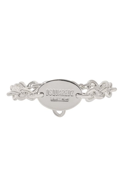 Для изготовления браслета в форме цепочки с крупными звеньями мастера марки использовали отполированный ювелирный сплав с гальваническим покрытием серебром. В центре аксессуара, застегивающегося миниатюрным карабином, — овальный медальон с выгравированным логотипом бренда.