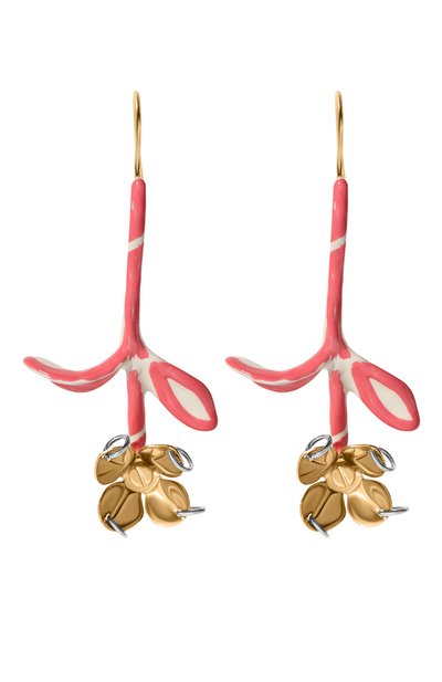 Длинные серьги выполнили в форме перевернутого цветка из ювелирного сплава с золотистым и серебристым покрытием. Бутон с сердцевиной в виде винта декорировали на каждом лепестке кольцом, стилизованным под украшение для пирсинга. Ярче аксессуар делает белая и розовая глянцевая эмаль, которой вручную разрисовали стебель и листья.
