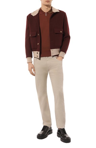 Красное поло с широким эластичным поясом и манжетами мастера марки выполнили из тонкого хлопкового трикотажа, который хорошо пропускает воздух. Материал связали из ультрадлинных волокон премиальных сортов, поэтому вещь на ощупь напоминает шелковую и почти ничего не весит.