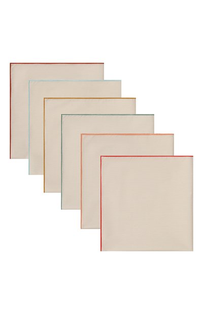 Для пошива пары бежевых салфеток использовали прочное льняное полотно с выразительной фактурой. За счет широкого подгиба изделия лучше держат форму после стирки. Принадлежность бренду, основанному Брунелло Кучинелли, обозначает небольшой патч с вышитым логотипом.