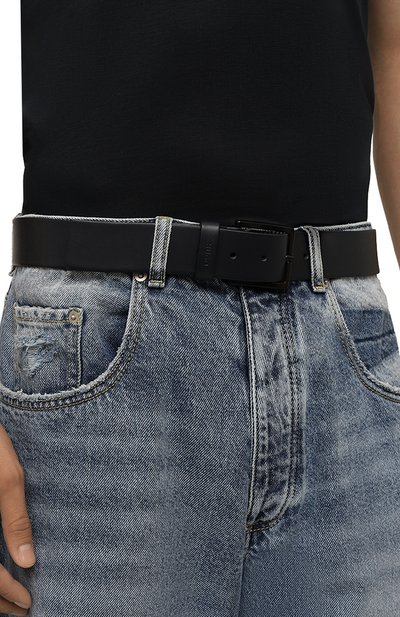 Черный ремень мастера марки выполнили из плотной гладкой кожи, которую бережно обработали до получения шелковистого блеска. Модель застегивается прямоугольной пряжкой в тон, украшенной рельефным логотипом бренда.