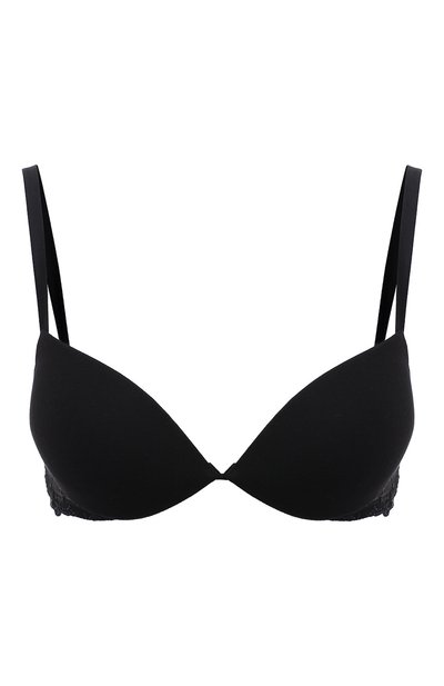 Для пошива черного бюстгальтера мастера марки использовали гладкий мягкий хлопок, в состав которого добавили эластан. Отделку пояса выполнили из полупрозрачного тонкого тюля с однотонной вышивкой. Чашечки на косточках дополнили съемными вставками с эффектом пуш-ап.