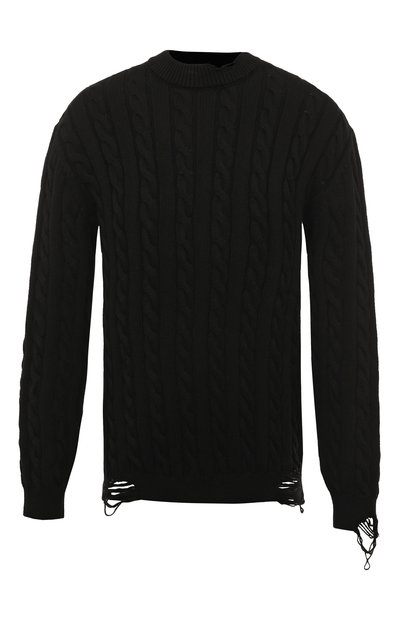 Черный свитер с фактурным арановым узором выглядит так, словно у него есть своя многолетняя история. Такой эффект создают крупные потертости на поясе, манжетах и вдоль круглого выреза. Для изготовления модели, декорированной сзади фирменным алым патчем, использовали мягкую хлоп ковую пряжу, поэтому она приятно ощущается на теле и не перегревает.