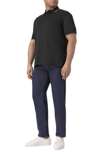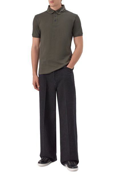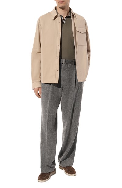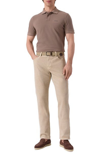 Серое поло с отложным воротником и короткими рукавами выглядит так, словно его выполнили из шелка. Иллюзию создает гладкий, слегка блестящий трикотаж, для изготовления которого использовали пряжу фильдекос. Ее скрутили из длинных нитей мерсеризованного хлопка, опаленных газовой горелкой. Модель из такого материала хорошо пропускает воздух, приятно ощущается на коже и вытягивается со временем.