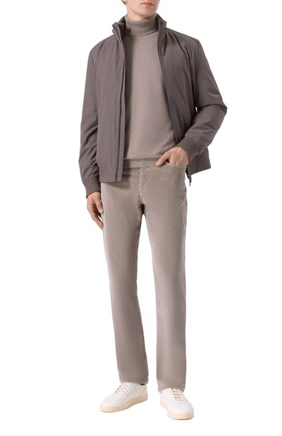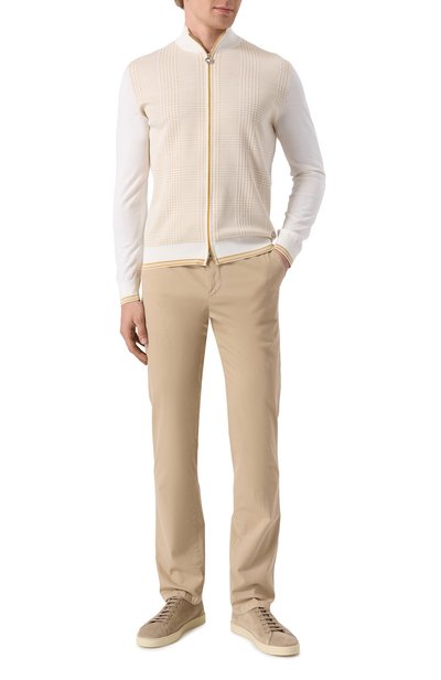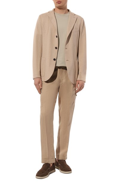 Лаконичные бежевые брюки органично впишутся в образ в стиле smart casual с рубашкой и пиджаком. Спортивное звучание модели с защипами спереди и прорезными карманами придает пояс с эластичной вставкой сзади и регулируемой кулиской. Для пошива изделия использовали мягкий тонкий лен, длинные волокна которого об ладают терморегулирующими свойствами.