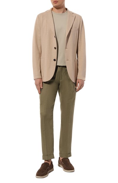 Льняные брюки с отворотами и защипами, переходящими в стрелки, дополнили четырьмя прорезными карманами. Сзади на поясе-кулиске со шлевками предусмотрели эластичную вставку. Модель застегивается на пуговицу и потайную молнию.