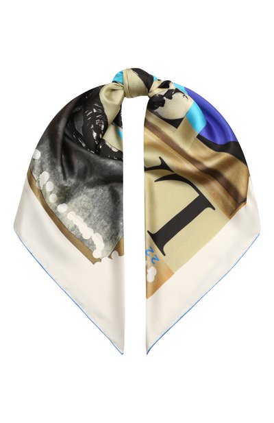 Создавая бежевый платок, команда бренда обратилась к истории марки. Яркий принт, составленный из нескольких черно-белых фотографий, напоминает о флагманском бутике бренда. Мотив нанесли на тонкий шелковый твил с характерным блеском.