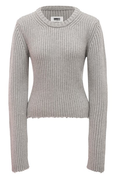 Изделия бренда, основанного Мартином Маржелой, легко узнать по знаковым потертостям, придающим одежде слегка состаренный вид. Есть такие и на укороченном сером пуловере из мягкой тонкой пряжи. В ее составе объединили дышащий хлопок и плотную шерсть, укрепив их нитями полиамида.