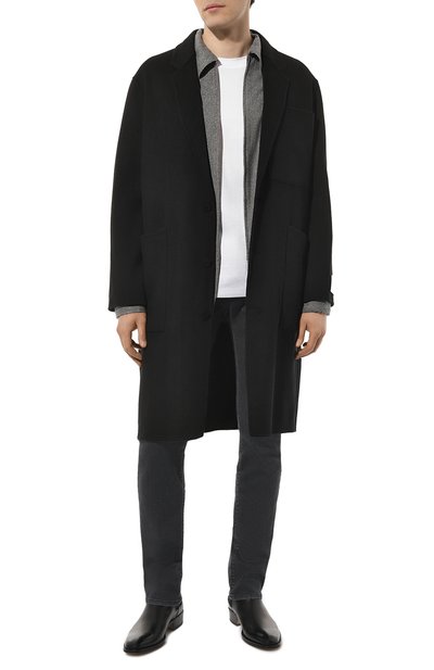 Немного зауженные темно-серые джинсы сшили из прочного эластичного хлопка, поэтому изделие комфортно садится по фигуре, не сковывая движения. Модель постирали в готовом виде, придав ей слегка неравномерный оттенок, а по краям сформировали небольшие потертости, чтобы создать эффект одежды с историей. Принадлежность пары бренду подчеркнули блестящей пластиной с выгравированным логотипом на заднем кармане.