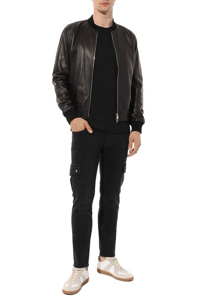 Немного зауженные темно-серые джинсы сшили из прочного эластичного хлопка, поэтому изделие комфортно садится по фигуре, не сковывая движения. Модель постирали в готовом виде, придав ей слегка неравномерный оттенок, а по краям сформировали небольшие потертости, чтобы создать эффект одежды с историей. Принадлежно сть пары бренду подчеркнули блестящей пластиной с выгравированным логотипом на заднем кармане.