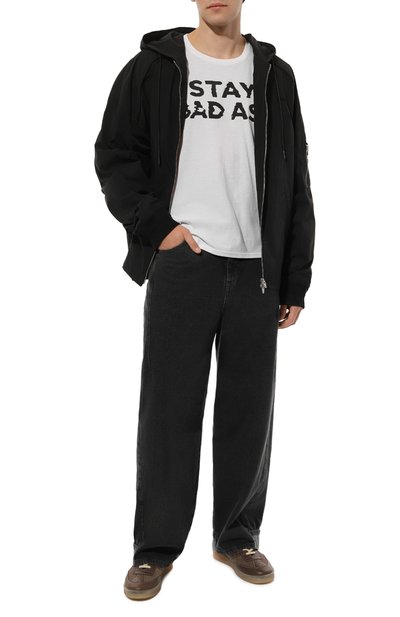 Молочно-белая футболка свободного силуэта сшита из гладкого хлопкового джерси с шелковистой текстурой. Мягкий эластичный материал хорошо пропускает воздух и не теряет со временем первоначальную форму. Легкая модель с круглой горловиной, спущенной линией плеч и короткими рукавами украшена спереди крупным л оготипом марки. Предлагаем составить монохромный непринужденный образ с кедами в тон и черными карго и тренчем.