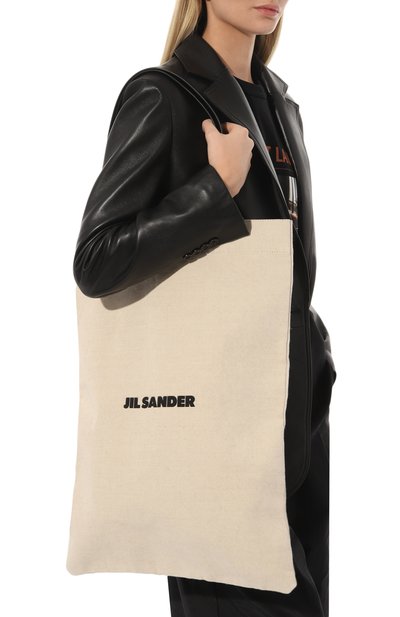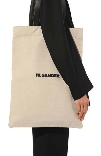 В черную сумку Book grande, самую большую из этой линии, поместятся бумаги формата А4, бутылка воды, кошелек, зонт, смартфон. Для создания аксессуара использовали прочный плотный канвас из хлопка и льна, а для двух длинных ручек и внутреннего кармана выбрали гладкую матовую кожу. Принадлежность марке, основанной Джил Сандер, обозначили крупным белым логотипом.