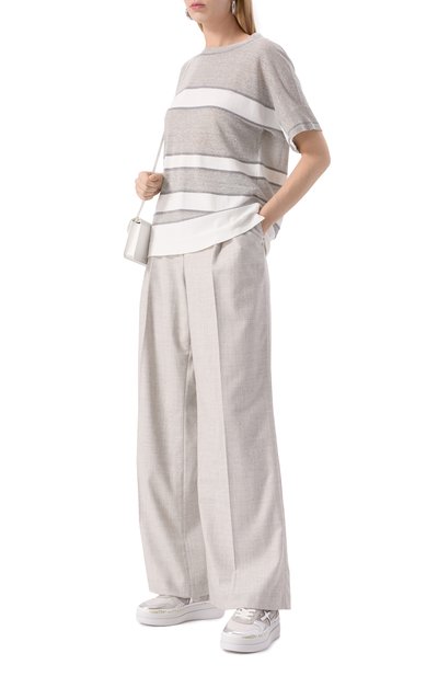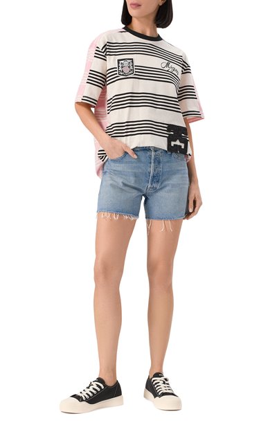Футболку в контрастную черно-бежевую полоску декорировали на спинке крупным патчем с логотипом бренда, основанного Джил Сандер. Для пошива модели полуприлегающего кроя использовали плотный хлопковый трикотаж, который хорошо удерживает тепло.