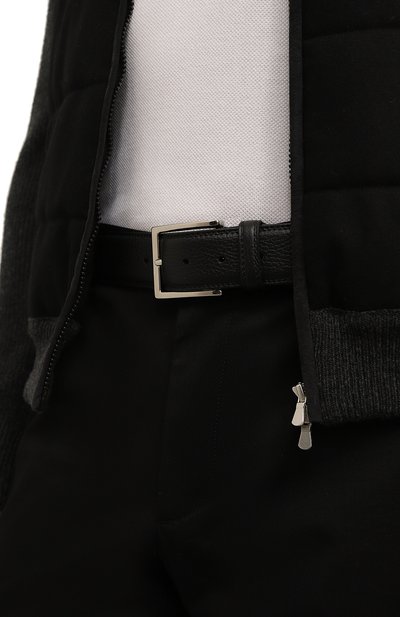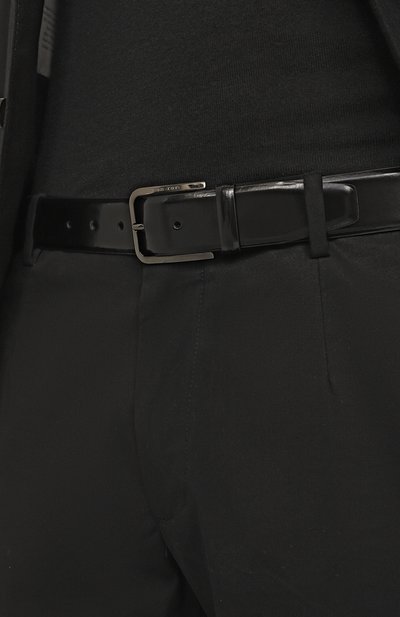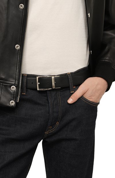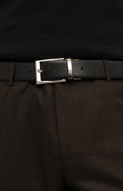 Мастера марки выполнили черный ремень из плотной фактурной кожи, отполированной до деликатного блеска. Аксессуар сделали двусторонним, поэтому его можно вывернуть, назначив главной коричневую сторону с более гладкой поверхностью. Модель застегивается лаконичной прямоугольной пряжкой.