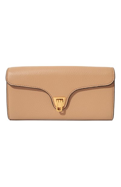 Мастера марки использовали для изготовления бежевого ко шелька особенно мягкую мерейную кожу, на которой долго не появятся потертости и царапины. Аксессуар со слотами для кредитных карт и отделением для банкнот и чеков, дополнили карманом на молнии. Модель закрывается клапаном с золотистым замком в виде плектра.