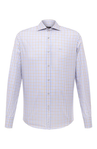 Для пошива рубашки в бежево-голубую клетку мастера марки использовали мягкую хлопковую ткань. Тонкий материал хорошо пропускает воздух, а прямой крой не сковывает движения, поэтому в такой модели с воротником акула будет комфортно весь день. Изделие украсили вышитой эмблемой в тон.