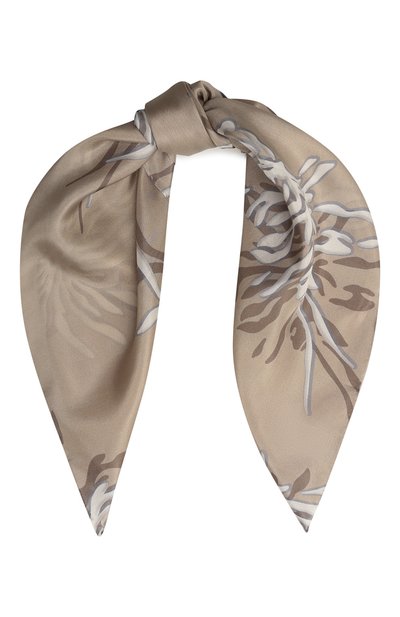Платок оттенка кофе с молоком мастера марки изготовили из тонкого премиального шелка с серым цветочным мотивом, будто парящим над гладкой тканью. Квадратный элегантный аксессуар с подшитыми вручную краями не мнется, долго сохраняет первоначальный вид и почти не ощущается на теле.
