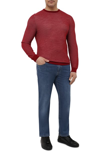 Базовый джемпер с круглой горловиной и рукавами реглан связали английской резинкой из хлопковой пряжи. Широкие эластичные манжеты модели подчеркнули узким контрастным кантом.