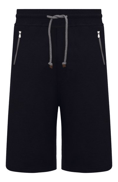 Для изготовления темно-синих шорт прямого кроя мастера марки, основанной Брунелло Кучинелли, использовали приятный на ощупь, премиальный хлопок, который немного тянется, не стесняя движения. За удобную посадку модели на талии отвечает широкий регулируемый пояс-кулиска с плетеным шнуром.