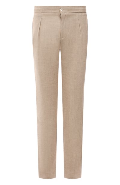 Дизайнеры марки сделали бежевые брюки с классической посадкой более комфортными. Модель из шелковистой легкой шерсти, которая идеально пропускает воздух, дополнили эластичным поясом с потайной кулиской и короткими вытачками на талии. Сочетать такое изделие предлагаем с тонким трикотажем и лоферами.