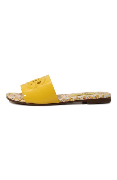 Желтые шлепанцы из линии Flowering повторяют дизайн модели Bianca из женской коллекции, поэтому подойдут для образа family look. Совпадают и широкая союзка из мягкой телячьей кожи, и рельефная монограмма DG с вырезами, и миниатюрный каблук. Единственное отличие – стелька с брендированным патчем и перфорированным узором, как у брогов.