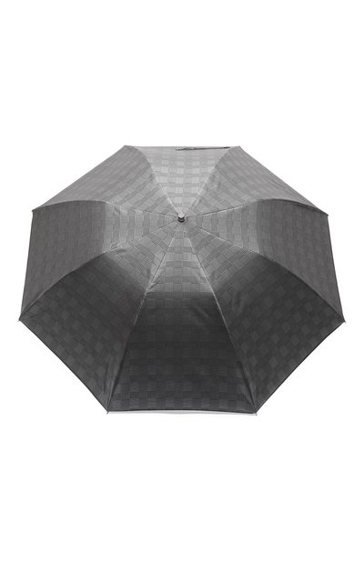 Для изготовления серебристо-серого складного зонта использовали прочный фактурный нейлон с жаккардовым плетением, стилизованным под клетку «принц Уэльский». Аксессуар с усиленным каркасом и автоматической системой раскрытия выдерживает сильные порывы ветра и тяжесть мокрого снега. Изогнутую ручку оплели узкими полосами мягкой кожи, поэтому она не скользит в руке.