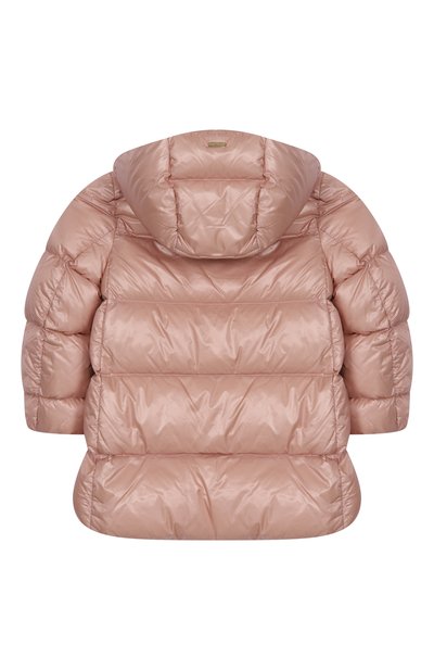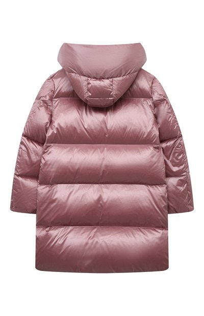Стеганый пуховик с высоким воротником-стойкой выполнен из глянцевого нейлона. Модель со съемным капюшоном украшена металлической эмблемой марки спереди. Куртка и два врезных кармана застегиваются кнопками.
