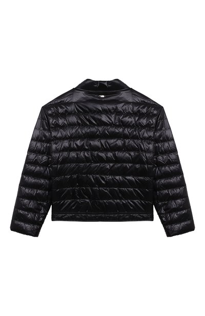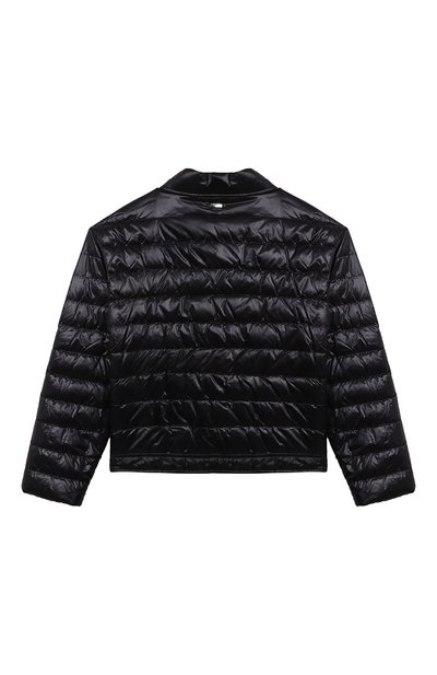 Для пошива стеганой куртки на гусином пуху использовали влагостойкий нейлон. Модель с серебристой эмблемой спереди и брендированной пластиной на спинке дополнили боковыми карманами с молниями.