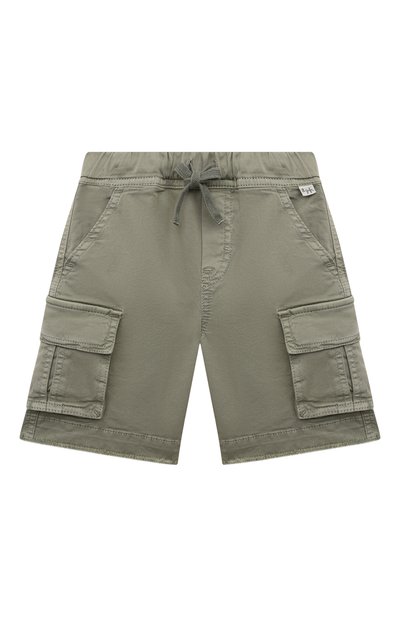 Для пошива прямых зеленых шорт с накладными карманами, словно позаимствованными у карго, использовали мягкий, но прочный хлопковый габардин. Чтобы придать ткани немного неравномерный оттенок, как у выгоревшей на солнце одежды, модель окрасили в готовом виде. За удобную посадку на талии отвечает широкий эластичный пояс с регулируемой кулиской.