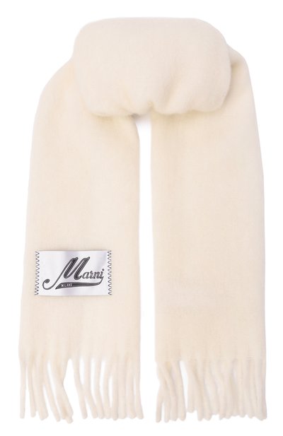 Шарф изготовили из исключительно приятной на ощупь шерсти альпака. Нити нейлона в составе пряжи не дают аксессуару потерять форму со временем. Широкую модель с длинной бахромой по краям украсили брендированным патчем.