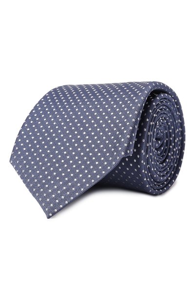 Синий широкий галстук с графичным гороховым паттерном, вытканным белыми нитями, выполнили из фактурного шелкового жаккарда. Прочный материал хорошо драпируется и быстро восстанавливает форму после развязывания узла, поэтому аксессуар долго будет выглядеть как новый.