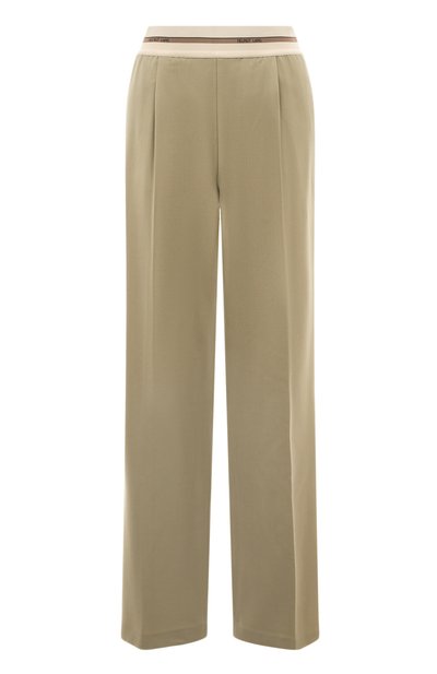 Дизайнеры марки, основанной Хельмутом Лангом, снизили градус формальности прямых бежевых брюк со стрелками, дополнив изделие широким эластичным поясом, как у спортивной одежды. Для пошива модели с прорезными боковыми и задними карманами использовали тонкий шерстяной твил. Чтобы сделать ткань более прочной и немнущейся, в ее состав включили стрейчевые волокна и шелковистый полиэстер.