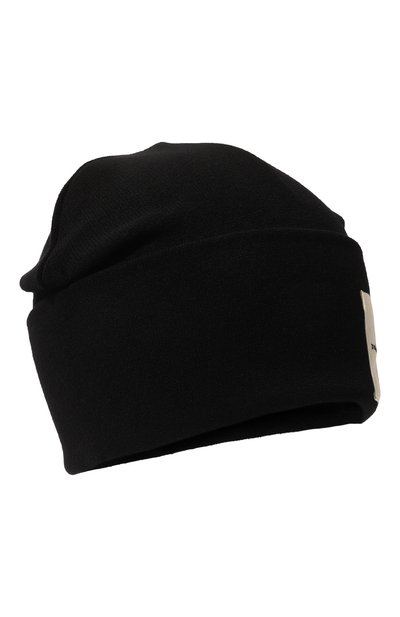 Для изготовления черной шапки бини с драпировками мастера марки использовали эластичный трикотаж из шелковистой дышащей вискозы с добавлением волокон полиэстера для прочности. Изделие из такого материала плотно облегает голову и долго не теряет безупречный вид. Широкий отворот декорировали крупным текстильным патчем со слоганом.