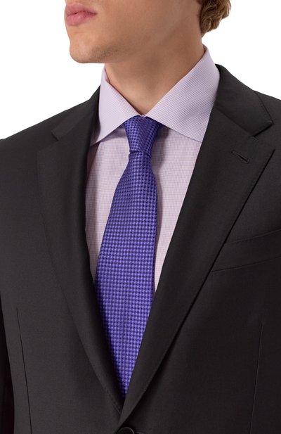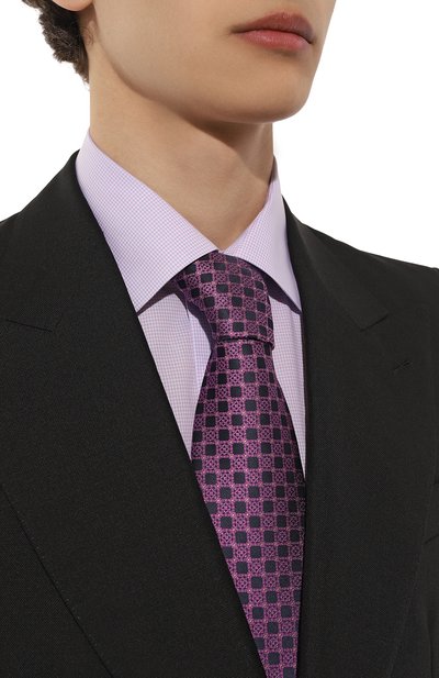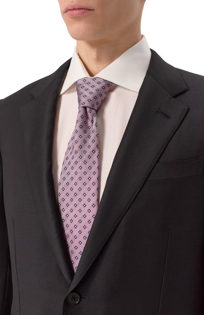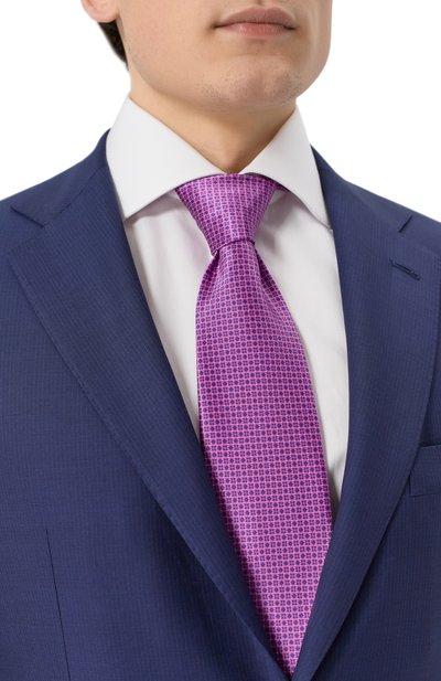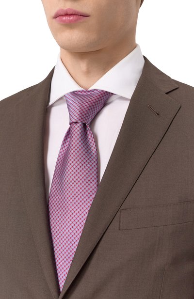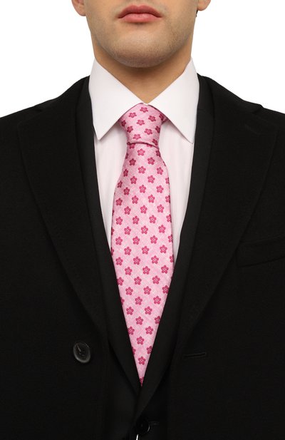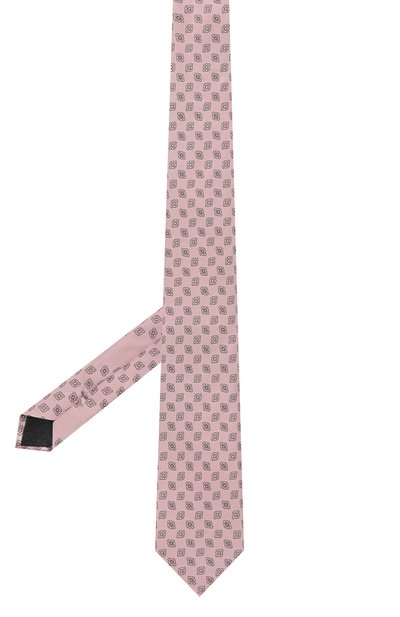 Розовый галстук с графичным узором создаст деликатный цветовой акцент в строгом образе. Для его пошива выбрали плотный гладкий шелк с характерным блеском, который хорошо держит форму узла. Детали аксессуара тщательно отутюжили и соединили эластичным ручным швом, который не позволяет модели перекручиваться.
