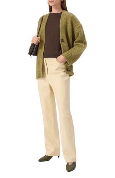 Белые брюки идеально подойдут для прохладного летнего вечера или прогулок в межсезонье. Модель изготовили из нежного кашемира, вычесанного из пуха монгольских коз. Суровые природные условия способствуют появлению у этих животных густого подшерстка, который даже тонкий трикотаж делает теплым. Посадку на талии регулирует эластичный пояс-кулиска.