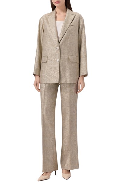 Серые прямые брюки с широким поясом-кулиской и двумя карманами связаны из почти невесомой кашемировой пряжи с шелковистыми тонкими волокнами. Изделия из такого материала согревают не хуже шерстяных аналогов и при этом почти не ощущаются на теле. Наши стилисты предлагают сочетать модель с кардиганом в тон, а также с топом, тренчем, сумко й и лоферами черного цвета.