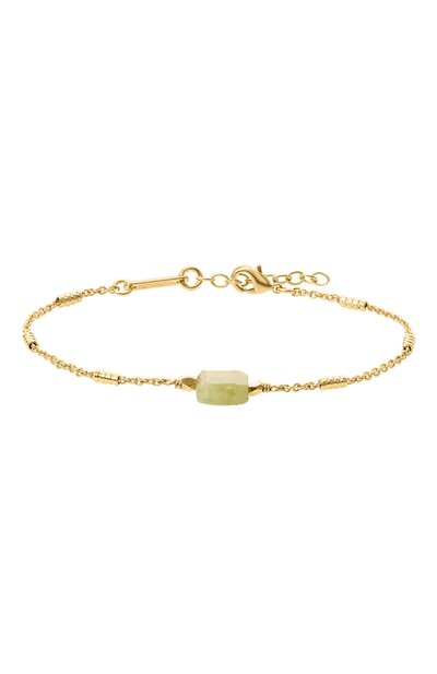 Длину узкого браслета удобно регулировать при помощи небольшого карабина. Эту деталь, как и само украшение, выполнили из ювелирного сплава с гальваническим покрытием золотом. Мягкое сияние металла поддерживают деликатные блики на центральном элементе из кианита с уникальным естественным рисунком.