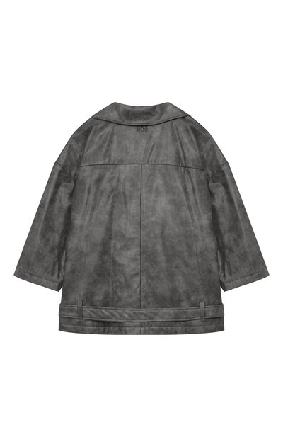 Куртка с супатной застежкой и атласным подкладом сшита из матовой экокожи. Модель прямого кроя дополнена отложным воротником и двумя накладными карманами с клапанами.