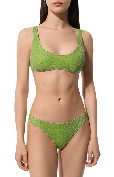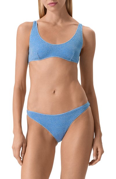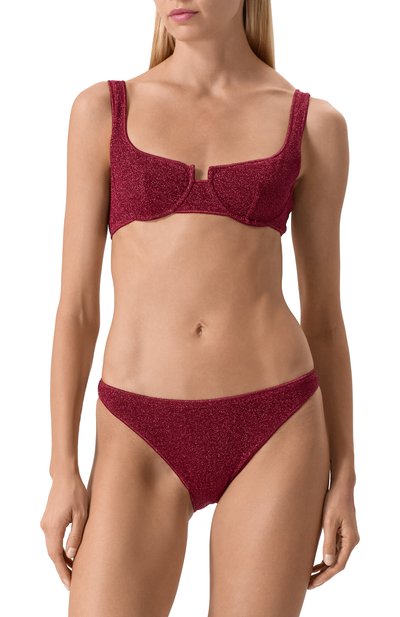Раздельный купальник из линии Lumiere сшили из фактурного быстросохнущего материала с добавлением люрекса. Бра с круглым вырезом дополнили плавками средней посадки.